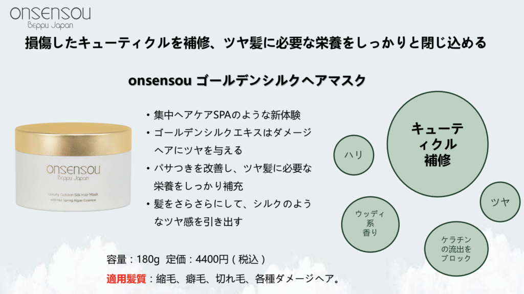 ONSENSOUの「ゴールデンシルクヘアマスク」は、