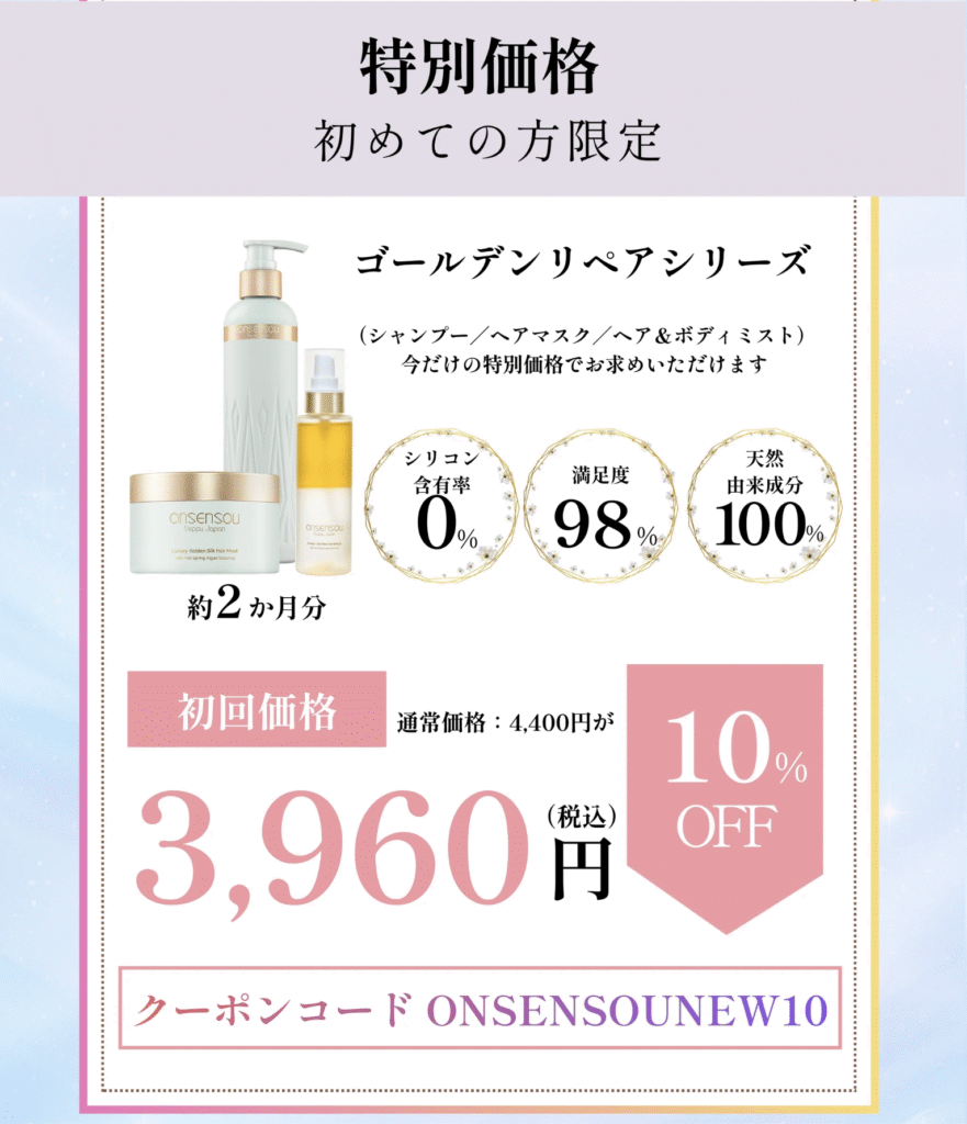この記事では、実際に私が使って感動した「ゴールデンシルクヘアマスク」の使用感や、リアルな口コミ、そしてお得に試せるクーポン情報までをまとめました。