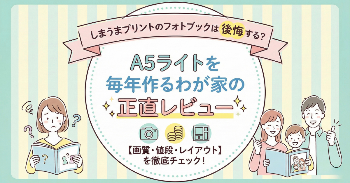 しまうまプリントのフォトブックには、画質や仕様のグレードがいくつかありますが、いろいろ試した結果、わが家では「A5サイズ × ライト仕様」が定番になりました。